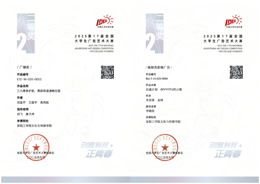 近日,第十七届全国大学生广告艺术大赛结果正式揭晓,文化传媒与航空服务学院学生荣获省级以上奖项100项,其中获国家级二等奖2项、国家级三等奖3项、国家级优秀奖4项、省级一等奖13项、省级二等奖40项、省级三等奖38项,燕京等17位老师被评为河南省优秀指导老师。